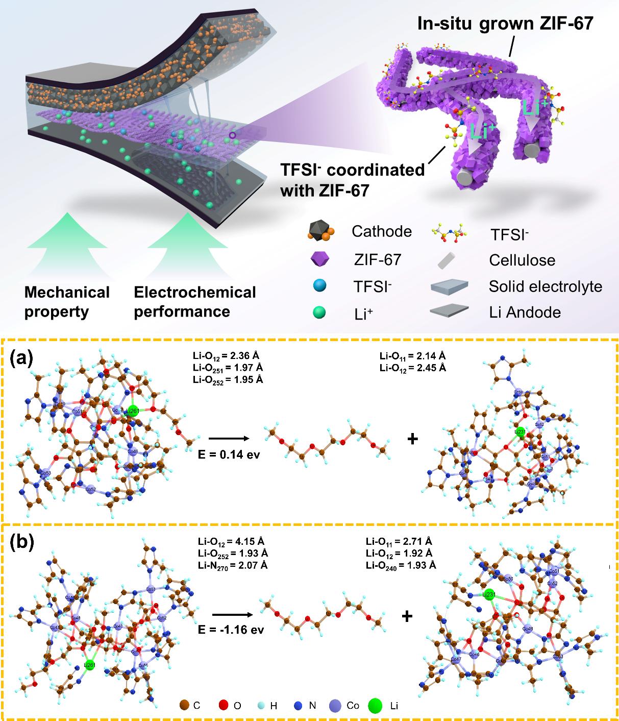 该工作采用了一种创新性策略,即通过融合刚性功能骨架与软聚合物电解质来制备增强的复合聚合物固态电解质(CPEs)。具体而言,将三维纤维素纤维骨架(CF)上原位生长沸石咪唑框架(ZIFs),并与增塑剂琥珀腈(SN)一同融入聚氧化乙烯(PEO)聚合物电解质中,从而成功研制出了ZIF-67@CF/PEO-SN CPEs。通过向PEO中添加ZIF-67@CF和SN,实现了CPEs安全性与电化学性能的协同提升。此外,该工作运用了密度泛函理论,深入探讨了Li+在CPEs中的传导机制。值得一提的是,在30 ℃条件下,ZIF-67@CF/PEO-SN CPEs展现出了出色的性能:离子电导率高达1.17×10–4S cm–1,Li+迁移数达到0.40,电化学窗口宽至5.0 V,抗拉强度显著提高,达到18.7 MPa,且锂镀层/剥离稳定性优异,能在0.1 mA cm2的条件下稳定运行超过550小时。这些特性使得LiFePO4/(ZIF-67@CF/PEO-SN)/Li电池在30℃时展现出高放电比容量(0.2C时达152.5mAh g–1)、长循环寿命(经过150次循环后,容量保持率高达99 %)以及出色的使用安全性。该工作不仅为功能化CPEs在全固态锂金属电池中的应用提供了深刻见解,同时也推动了室温全固态电解质的发展。