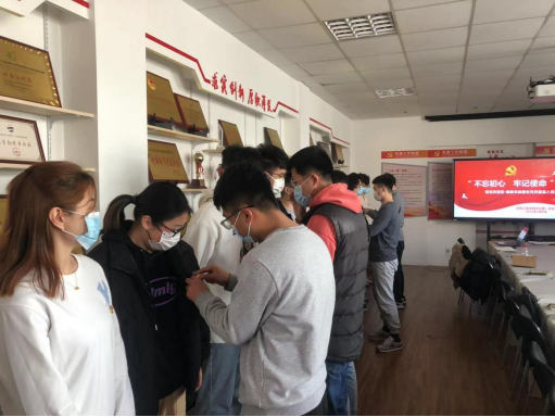 仪式在庄严的《国际歌》中拉开序幕,全体党员在支委会成员李信卿同志的带领下,面对党旗庄严宣誓。老党员为新发展党员佩戴党徽,叮嘱新党员要牢记入党誓词,不忘初心,牢记使命,时刻以党员标准规范言行,努力学习,扎实工作。